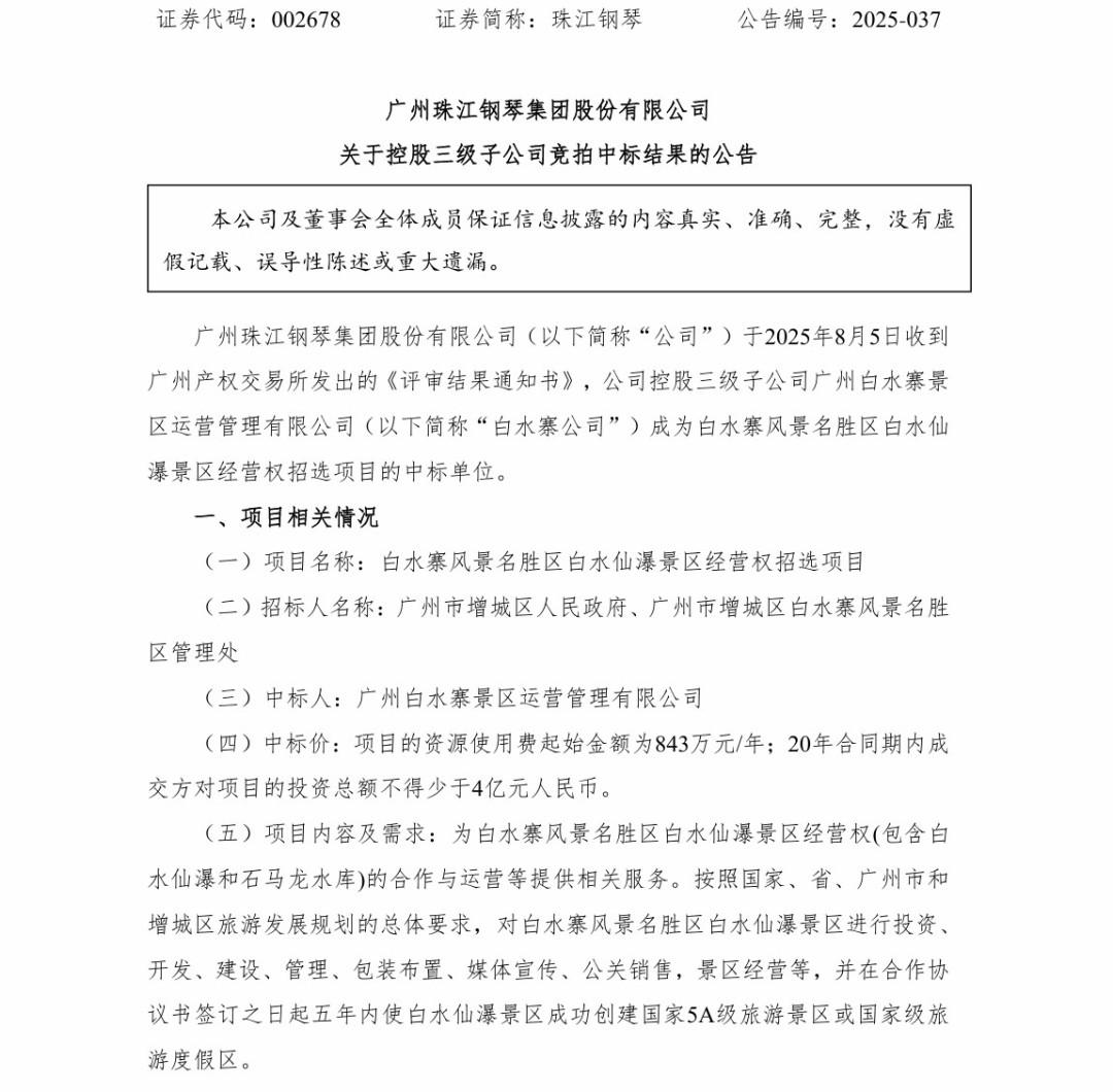 值得注意的是,珠江钢琴集团于2025年8月正式取得白水寨风景名胜区白水仙瀑景区经营权,迈出从“世界级乐器制造商”向“音乐文化服务商”转型的重要一步。根据规划,未来五年内珠江钢琴集团将推动景区创建国家5A级旅游景区,合同期内总投资不少于4亿元,通过引入高水准艺术资源与创意表达方式,全面提升景区文化内涵和品牌价值。
