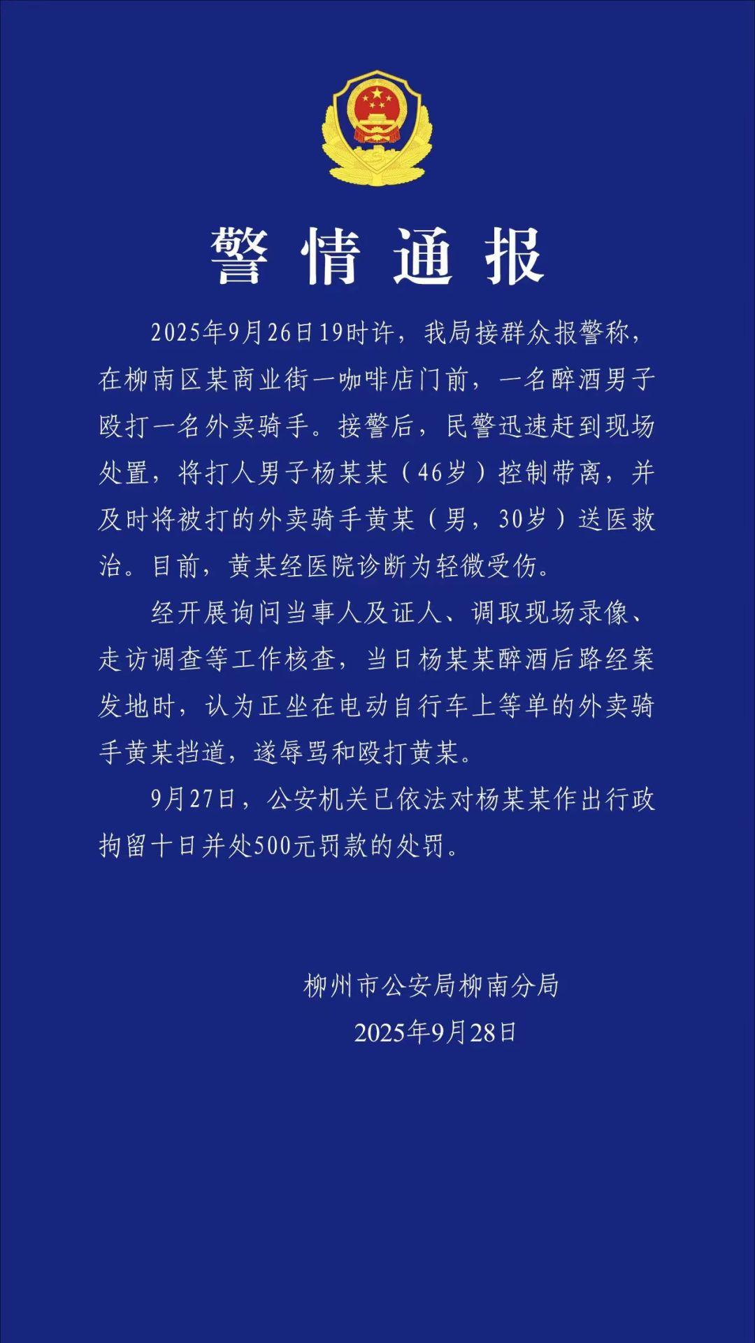 9月28日,广西柳州市公安局柳南分局发布警情通报:经开展询问当事人及证人、调取现场录像、走访调查等工作核查,当日杨某某醉酒后路经案发地时,认为正坐在电动自行车上等单的外卖骑手黄某挡道,遂辱骂和殴打黄某。9月27日,公安机关已依法对杨某某作出行政拘留十日并处500元罚款的处罚。