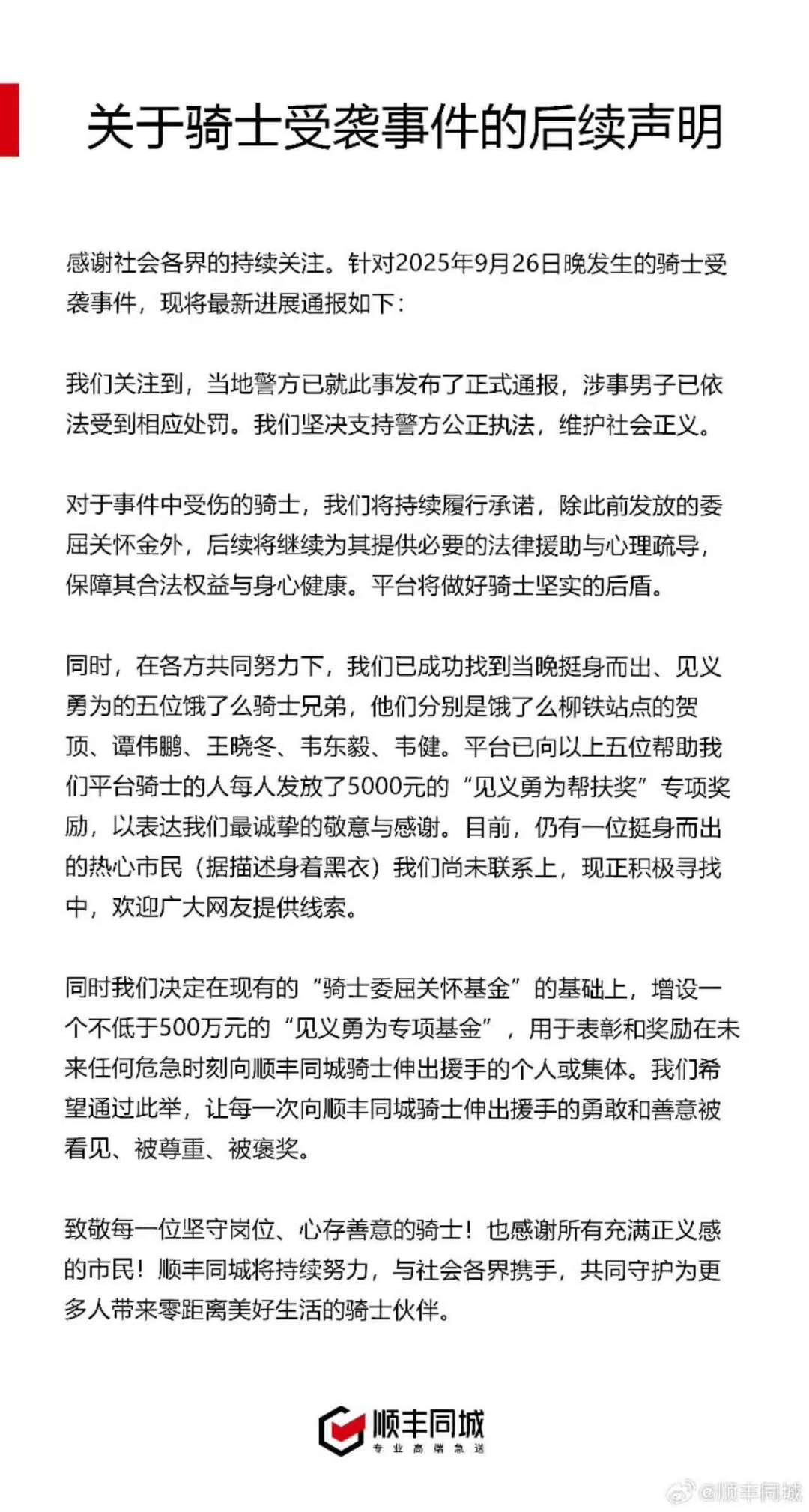 此外,顺丰同城声明中还宣布了一项长期举措:决定在现有的“骑士委屈关怀基金”基础上,增设一个总额不低于500万元的“见义勇为专项基金”,用于表彰和奖励在未来任何危急时刻向顺丰同城骑士伸出援手的个人或集体。平台表示,希望通过此举,让每一次向顺丰同城骑士伸出援手的勇敢和善意被看见、被尊重、被褒奖。