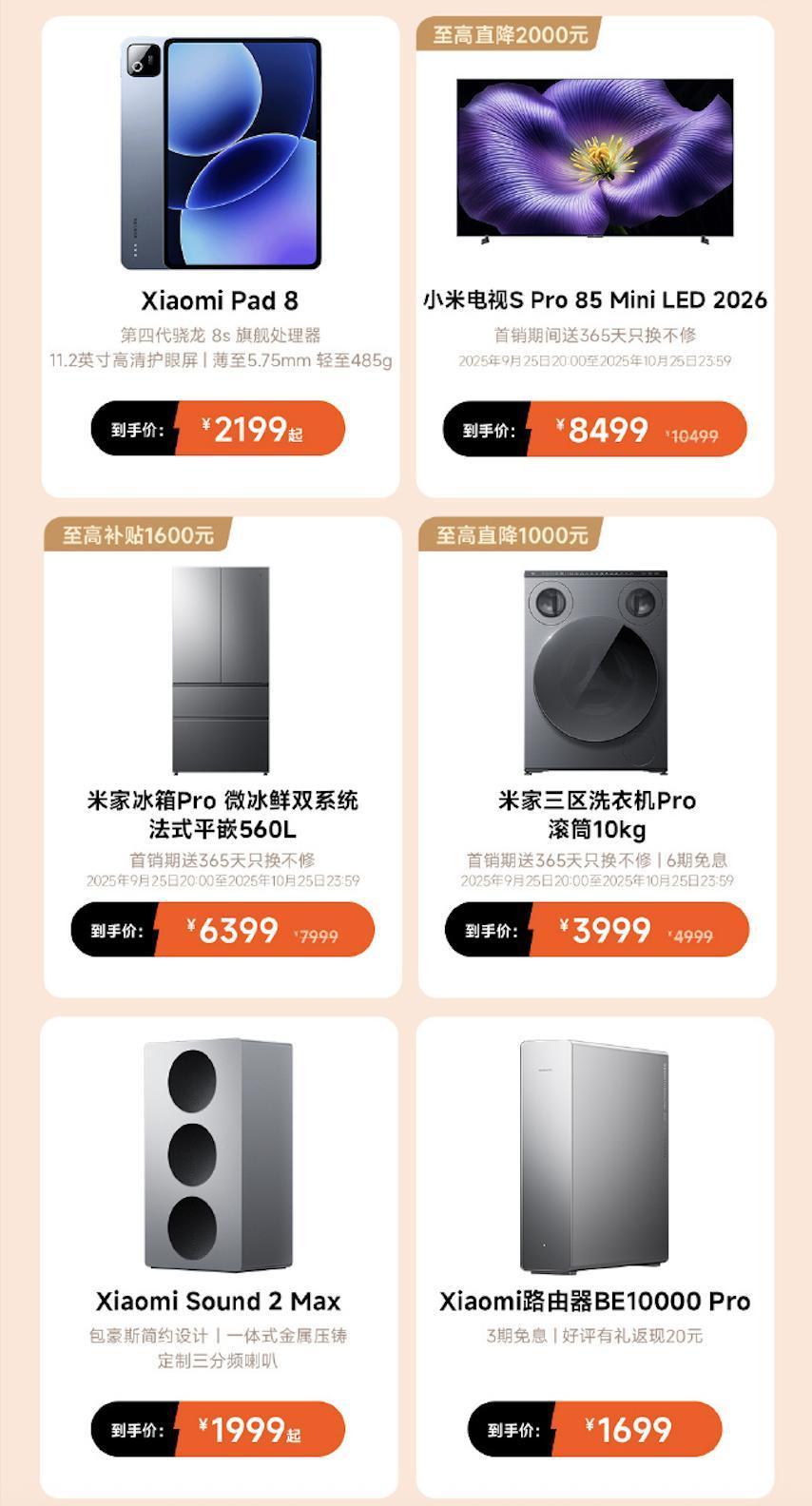另据了解,在科技家电方面,小米针对各品类都推出了大额优惠活动。值得关注的是,空调、洗衣机、电视机等品类也加入大促,当中还包含了许多网红产品。比如此前全新推出的米家三区洗衣机Pro滚筒10kg优惠千元,到手价3999元。与此同时,生态链好物也同步放价,平板电脑最高直降500元,还有净水器、机器人等也加入大促。
