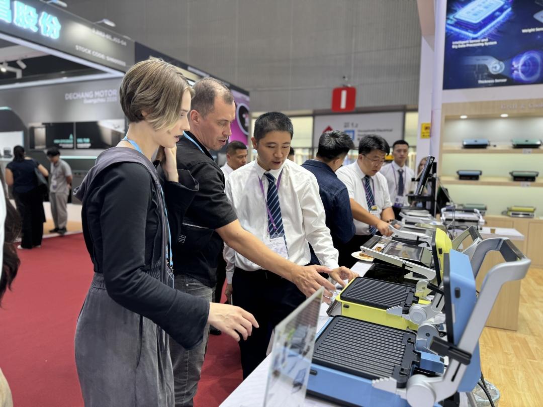 漳州灿坤实业有限公司展位前最新推出的一款“智能牛排机”,配备了工业级高精度NTC智能温控系统、智能感应系统、智能烹饪计算系统等一系列“硬科技”,因“0基础的小白也能做出大师级美味”的宣传吸引了不少外国客商围观。