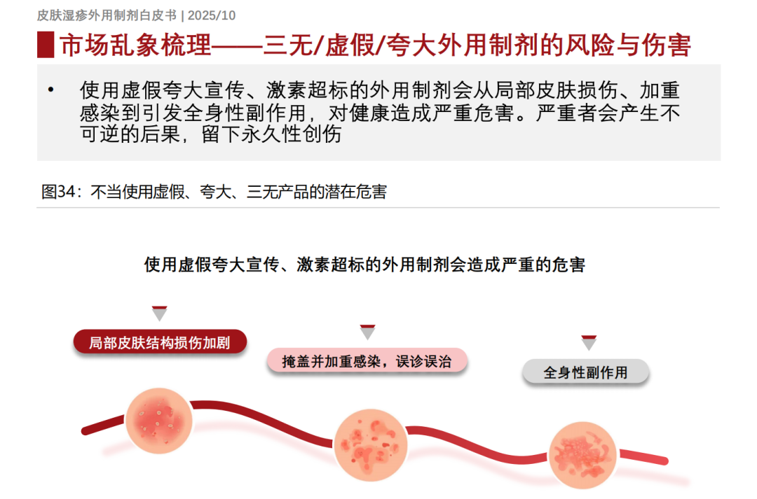 乱象二:误用含隐性激素类产品,或致不可逆的副作用消费者在不知情的情况下长期或过量应用这类产品,会因其中非法添加的强效激素而严重损害皮肤屏障,导致皮肤萎缩、敏感,并诱发激素依赖性皮炎。一旦大量吸收,可能引发全身性内分泌紊乱,甚至对儿童造成不可逆的生长抑制。