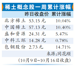 受政策调控及国际动态多重因素驱动,本周稀土板块表现亮眼。10月13日,A股低开高走,稀土概念股领涨,板块内19只个股涨停或涨幅超10%。截至10月16日收盘,北方稀土、中科三环、盛和资源股价虽有所回落,但得益于此前涨幅,前三季净利润增幅均达100%以上。