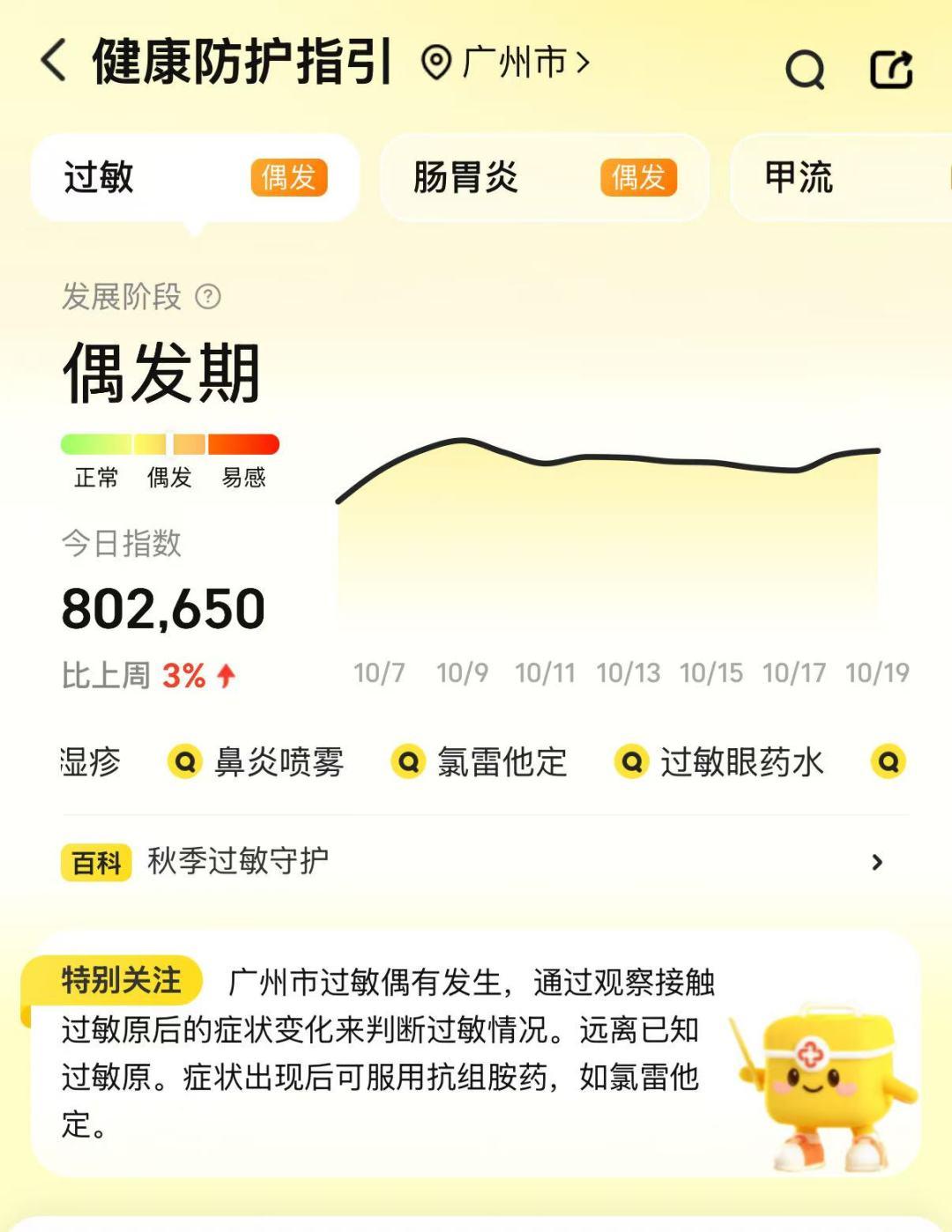 美团买药发布的广州市健康指引显示:10月20日,多种疾病、症状指数均较上周增长,其中就包括甲流指数增长38%、过敏指数增长3%等。
