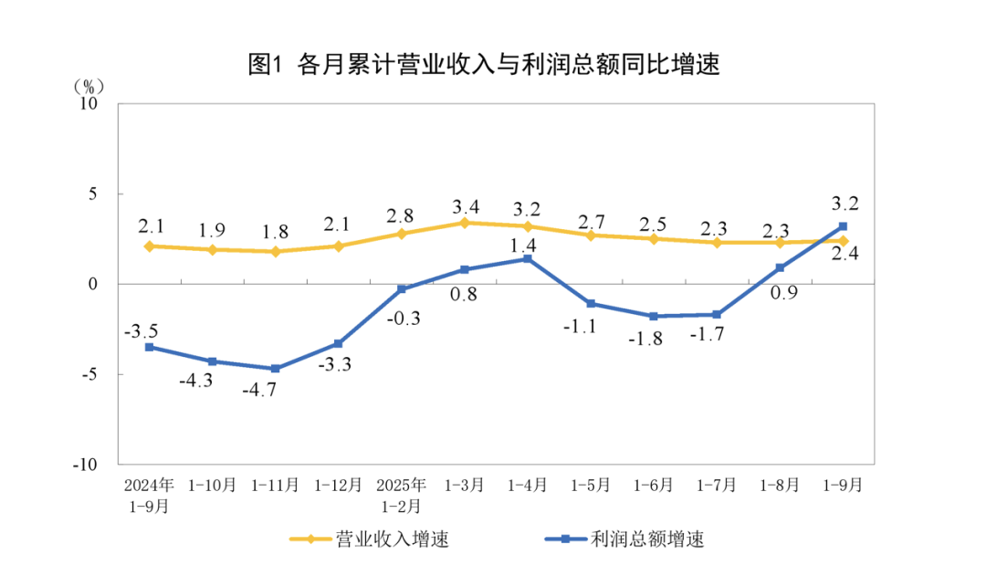 10月27日,国家统计局公布2025年1—9月份工业企业利润数据。数据显示,1—9月份,规模以上工业企业利润同比增长3.2%,为去年8月份以来各月累计最高增速;较1—8月份加快2.3个百分点,呈现加快恢复态势;过半行业利润增长,六成行业增速回升。