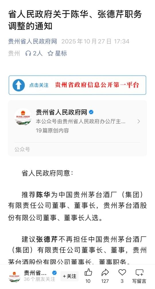 10月27日,贵州省人民政府网发布一则通知《省人民政府关于陈华、张德芹职务调整的通知》,贵州省人民政府同意推荐陈华为中国贵州茅台酒厂(集团)有限责任公司董事、董事长,贵州茅台酒股份有限公司董事、董事长人选。建议张德芹不再担任中国贵州茅台酒厂(集团)有限责任公司董事长、董事,贵州茅台酒股份有限公司董事长、董事职务。