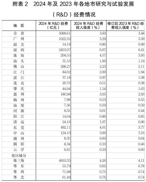 11月25日,广东省统计局、广东省科学技术厅、广东省财政厅最新发布的《2024年广东省科技经费投入统计公报》显示,去年全省共投入研究与试验发展(R&D)经费5099.61亿元,比上年增加296.99亿元,增长6.2%,经费投入稳定增长,投入强度持续提升。其中,规上高技术制造业研究与试验发展(R&D)经费实现同比两位数增长。深圳、广州等多个城市的研究与试验发展(R&D)经费投入超百亿元、经费投入强度超全国平均水平。
