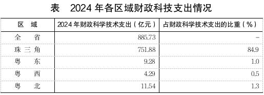 按区域分,珠三角地区财政科技支出751.88亿元,占84.9%;粤东地区支出9.28亿元,占1.0%;粤西地区支出4.29亿元,占0.5%;粤北地区支出11.54亿元,占1.3%。