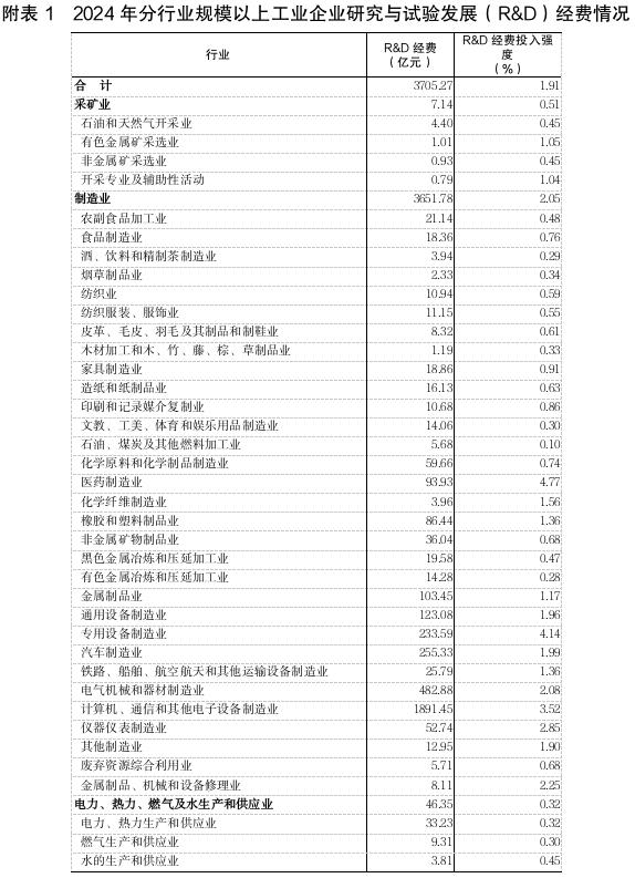 分产业部门看,规模以上高技术制造业研究与试验发展(R&D)经费2287.84亿元,比上年增长13.2%;投入强度(与营业收入之比)为3.64%,比上年提高0.07个百分点。在规模以上工业企业中,研究与试验发展(R&D)经费投入超过百亿元的行业大类有6个,比上年增加1个,这6个行业的经费占全部规模以上工业企业研究与试验发展(R&D)经费的比重为83.4%。