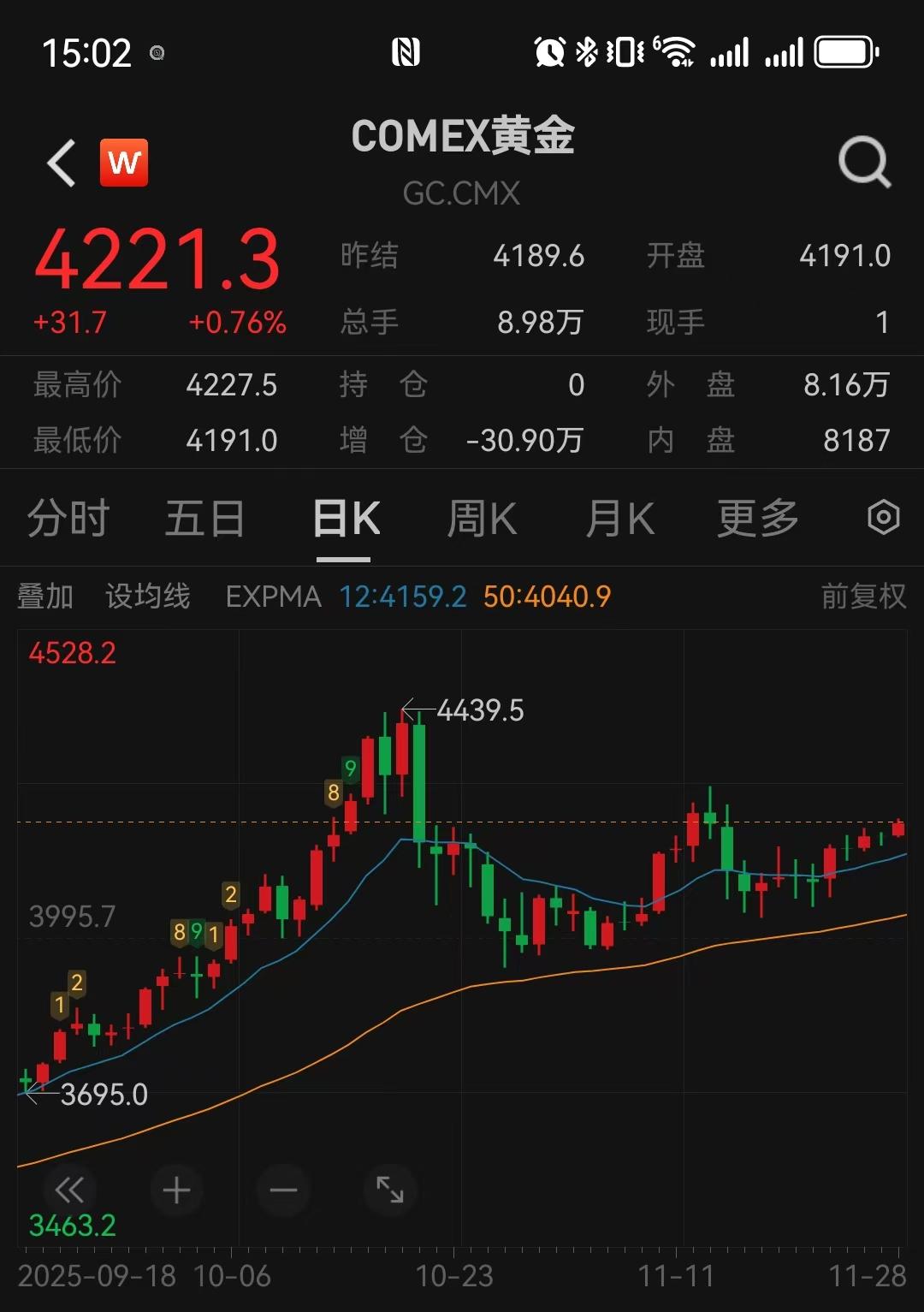 北京时间11月28日,COMEX黄金期货价格早盘持续拉升,强势突破4200美元整数关口。截至15时02分,COMEX黄金期货报4221.3美元/盎司,日内涨幅0.76%;伦敦金现报4187.15美元/盎司,日内涨幅0.73%。国内市场,沪金主力合约收盘价953.92元/克,日内涨幅0.76%。