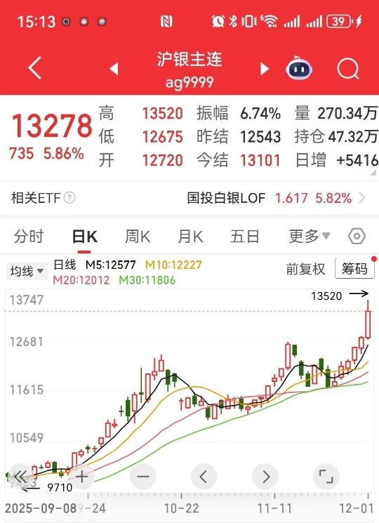 截至发稿前,伦敦银现高位报57.857美元/盎司。国内方面,截至12月1日收盘,沪银主力合约报13278元/千克,日内涨幅逼近6%。