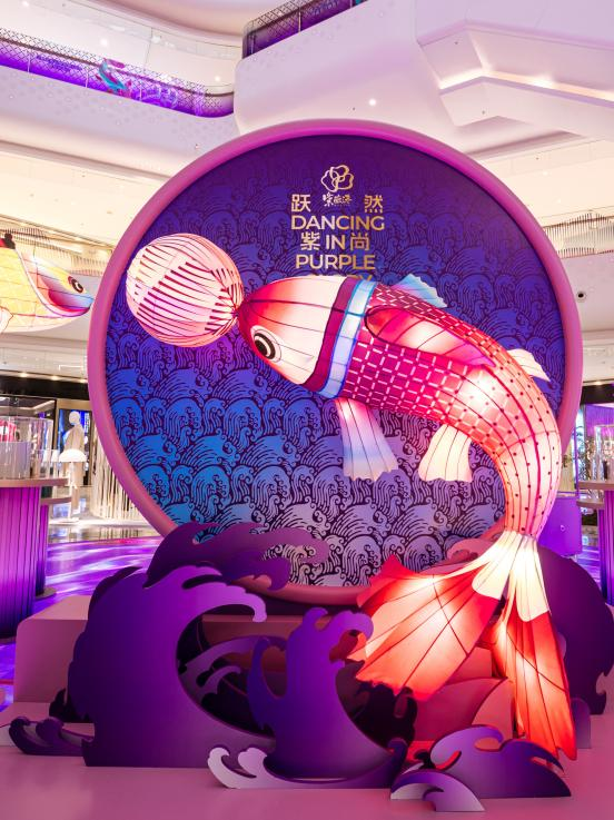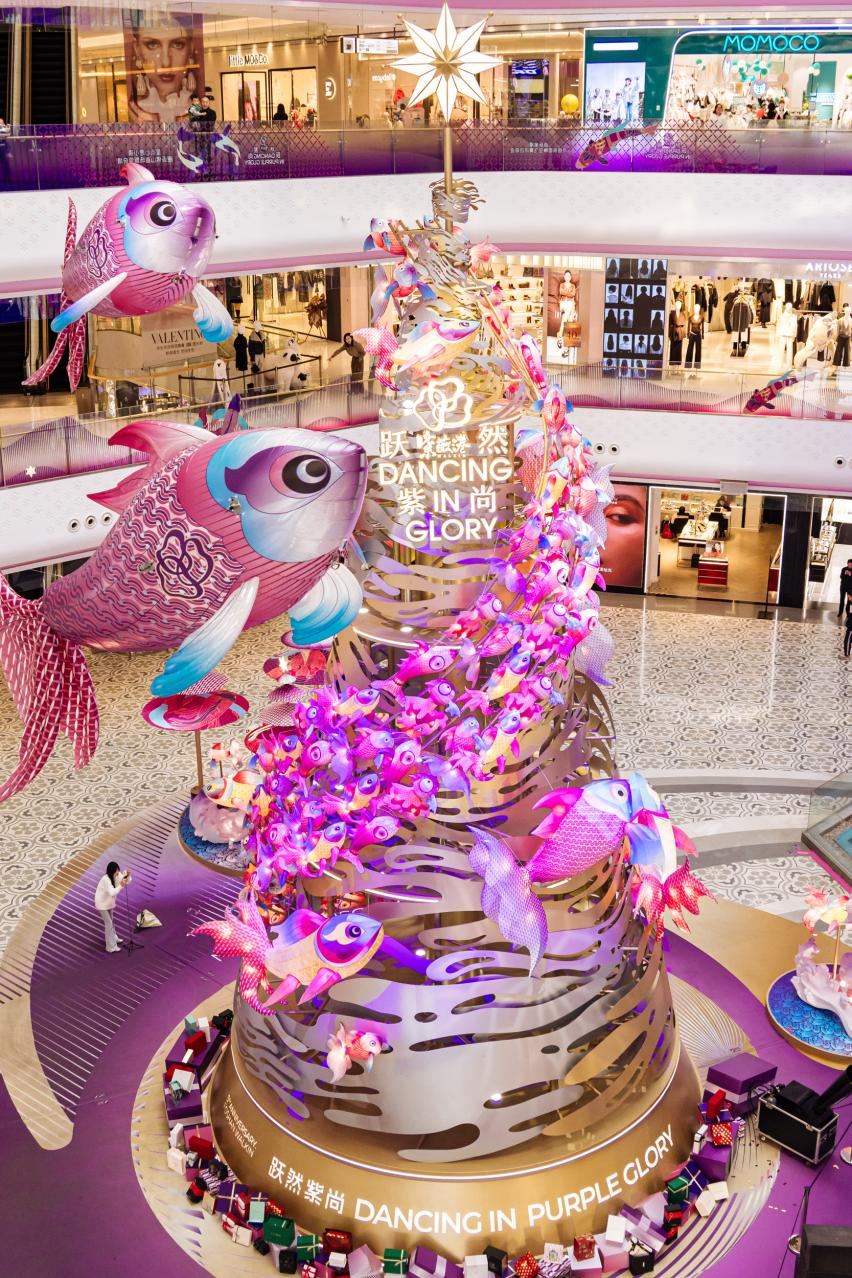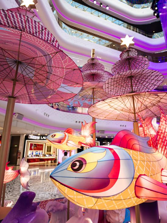 步入水中庭,映入眼帘的鱼灯树,搭配35米高的光影巨境,伴随悬浮鱼灯的轻盈舞动,仿佛将顾客带入梦幻世界。在花中庭,非遗鱼灯跃上节日树梢,与水面倒影交织成趣;4米高的空飘鱼灯悬置于山中庭,以当代设计语言重新诠释传统工艺,营造出鱼游天际的灵动画面。来到户外,怪趣毛绒树、星光灯饰与粉紫锦鲤点缀星尚花园,温馨浪漫的节日氛围随之来袭,为市民游客带来一场唯美新潮的非遗鱼灯之旅。
