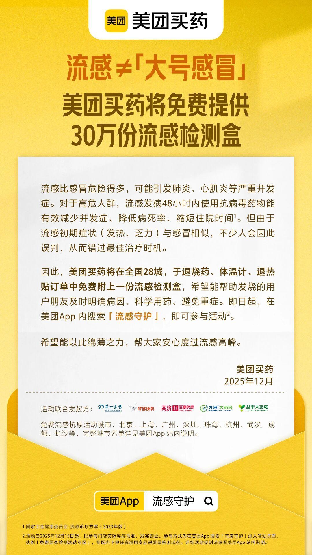 近期,全国流感疫情整体处于高流行水平。美团买药宣布,为协助公众应对流感,本周起将在全国28个城市的部分退烧药、体温计、退热贴等发烧类产品订单中,免费附上共30万份流感检测试剂。