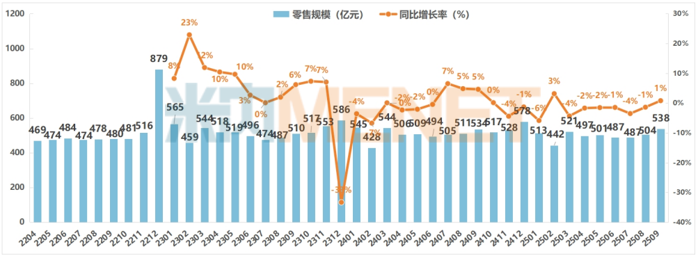 米内网零售数据库最新数据显示,2025年9月中国实体药店零售规模(含药品与非药品)达538亿元,较8月的504亿元实现明显上升,呈现出连续两个月的回升态势,市场回暖迹象进一步凸显。从同比维度看,9月实现0.8%的微弱正增长,在前期震荡基础上延续了微弱的增长势头,反映出市场在消费需求释放、行业自我调整等因素作用下有向好的变化,实体药店市场的复苏动能在积聚。