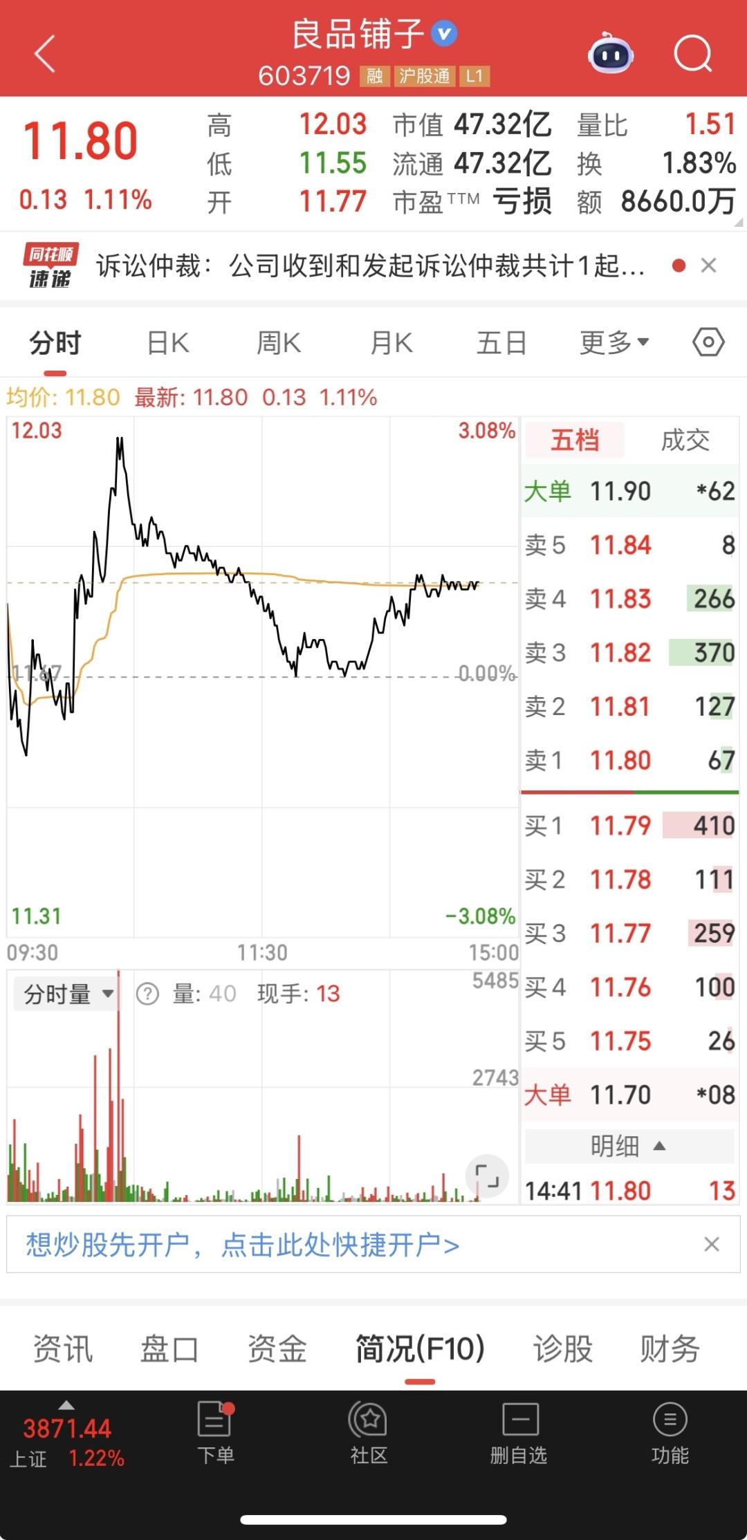 良品铺子股价今日开盘后略有回升,截至记者发稿前,报11.80元,微涨1.11%。广州轻工申请解除大部分股份冻结后,仅继续冻结价值4000万元的327万股股份。根据变更后的诉讼请求,广州轻工要求的违约金及费用合计2073.86万元,较最初索赔金额大幅下降。如果宁波汉意能够提供等值财产进行置换,广州轻工愿意同步解除全部股份的诉讼保全措施。