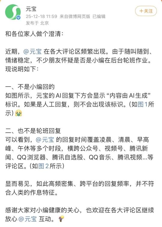 12月18日,腾讯官方就最近有部分用户质疑元宝“你到底是AI还是人啊?”进行回应。腾讯表示,一切带有“内容由AI生成”字样的评论均由元宝AI生成,背后没有人工运营,没有团队轮班。如果用户收到了元宝的评论回复下面没有带“内容由AI生成”的标识,就是背后的小编逐字逐句、有情有感的真人回答。