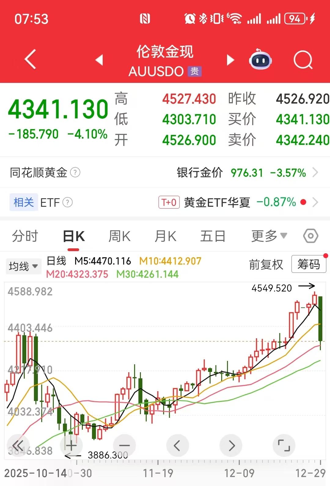 截至北京时间7时54分,伦敦金现跌超4%,报4341.13美元/盎司。国内方面,沪金下跌4%,报975.8元/克。