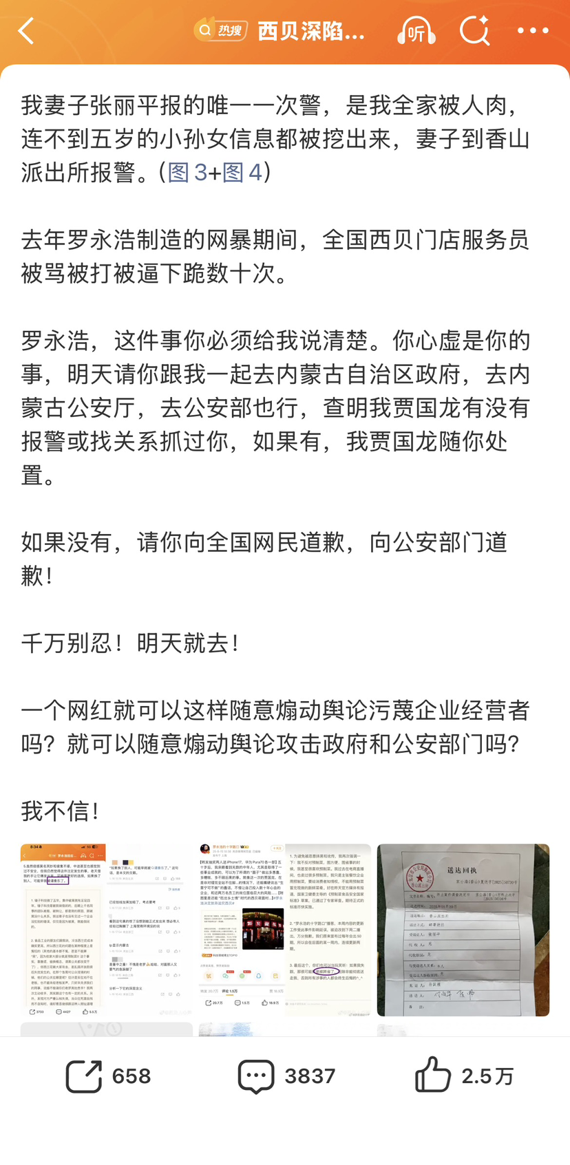西贝餐饮创始人贾国龙今天下午在多平台上称今晚十点将全面回应罗永浩,引起全网关注,并登上热搜。但十点不到,记者留意到,“西贝人心声”微博账号发布一篇长文,标题为《西贝遭罗永浩污蔑回应(一)》,文中自称是贾国龙,以第一人称撰文,通过此文对罗永浩的相关指控进行全面回应。文中表示“现在还没到十点”,而此前贾国龙在预告中称将在十点发布内容。