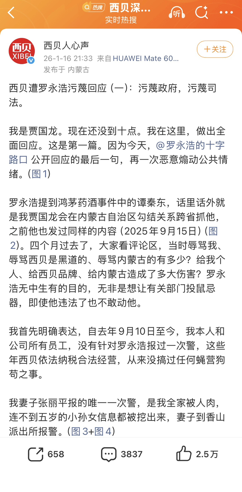 记者留意到,该微博号为“内蒙古西贝餐饮集团有限公司”认证,简介写着“西贝官方辟谣号”,审核时间为2026年1月15日。该微博号仅发布此微博内容一条。而截至记者发稿,“西贝XIBEI官方微博”以及贾国龙个人微博号“西贝贾国龙”等号皆无发布此文。有消息称,罗永浩以及贾国龙双方微博账号均被禁言。