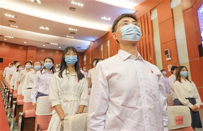 广州医科大学附属市八医院新冠肺炎救治临时党委组织领导班子成员,国家、省、市专家,院中层干部代表集中收看庆祝中国共产党成立100周年大会直播,并于会后重温入党誓词。广州日报全媒体记者陈忧子摄