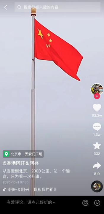 天安门上空飘扬的五星红旗,简短的一行文字描述:“从香港到北京,2000公里,站一个通宵,只为看一次升旗”,这条看似简单的短视频,引发了广大网友的关注,点赞量达到63.3万,而这条视频的创作者,是两位来自香港的青年阿轩(梁刘轩)和阿兴(黄文兴)。