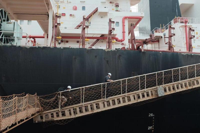 记者一行登上停靠在湛江港的40万吨级货轮。