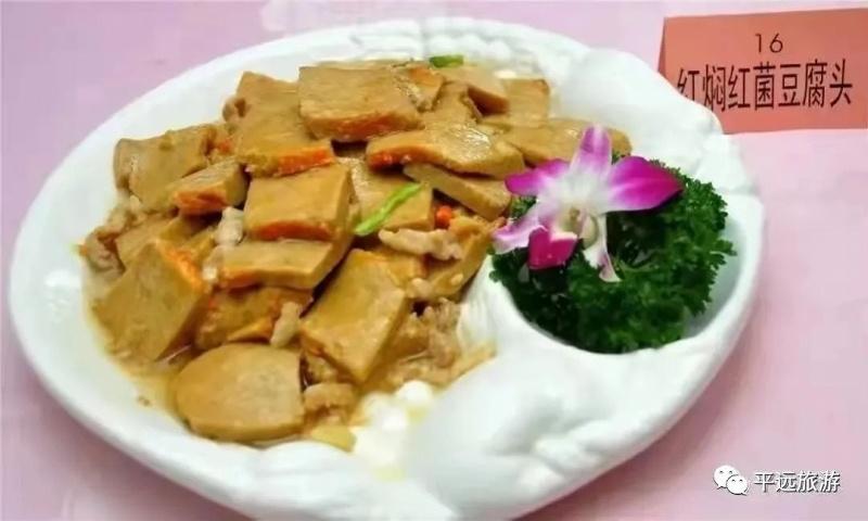 红菌豆腐头是平远县仁居镇的一道特色菜。红菌豆腐头由真菌发酵而成,菌与豆腐的完美结合,富含营养物质。红菌豆腐头的吃法多样,最常见的是做汤,即用猪肉、水咸菜、红菌豆腐头加葱花等配料煮成汤,鲜甜可口,或者将红菌豆腐头和猪肉等焖煮,味道鲜美,清甜入口。2009年,平远红菌豆腐头传统技艺被列入梅州市市级非物质文化遗产代表性项目保护名录。