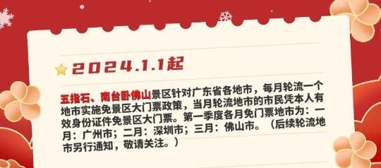 2024年平远旅游惠民优惠措施出炉啦!平远五指石、南台卧佛山两大景区将从2024年1月起,每月轮流省内1个地市实施免景区大门票政策,当月轮流地市的市民可凭本人有效身份证件免景区大门票。