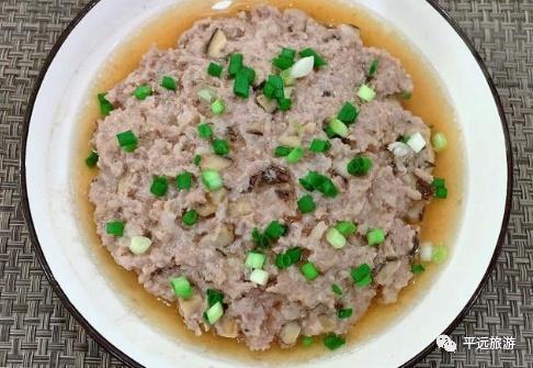 平远县仁居镇的一道特色菜。选用仁居镇本地土猪肉为原料,手工把猪肉剁成肉馅并配上盐,直接放碗里蒸熟即可上桌,这样蒸出来的肉饼味道鲜甜。