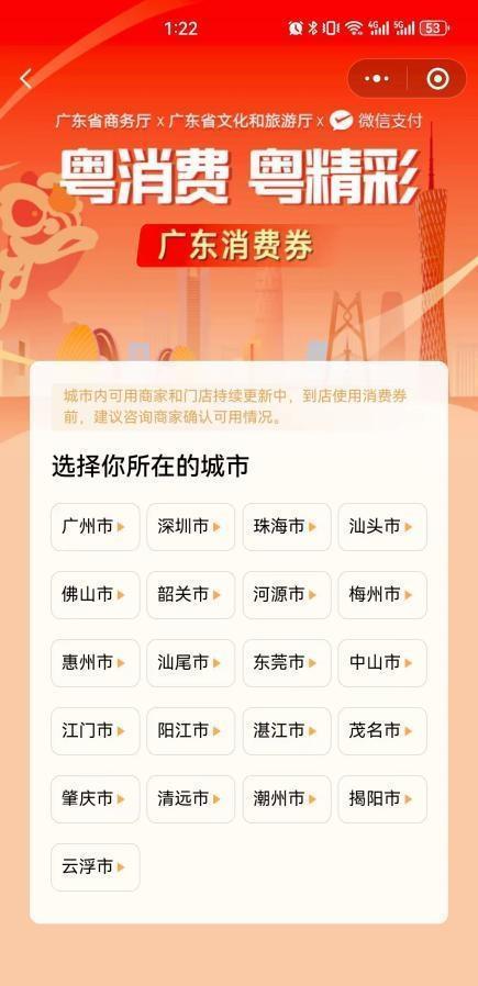 广东“粤消费 粤精彩”消费券第四轮活动继续采用“预约报名,在线开奖”的方式进行,设备实时地理位置定位在广东省且已开通微信支付实名认证账户的消费者均可参与。