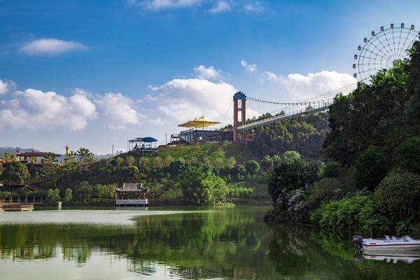 信宜莲花湖庄园是国家3A级旅游景区,位于茂名市信宜市北郊池洞镇,地处两广交界处,占地600余亩,由旅游景区、百越小镇餐饮和温德姆酒店三个板块组成。莲花湖庄园围绕“百越文化”“长寿之乡”和“全国生态保护与建设示范区”三张国家级名片,创建生态旅游、休闲度假康养的主题度假区。景区内有莲花湖、环湖绿道、德化长廊、文化长廊、浪漫情人谷、欢乐世界、玻璃桥、摩天轮等景点,致力打造以山川、湖泊为主体,融入自然景观和人文景观,集美食、娱乐、休闲、观光、养生、艺术文化交流于一体的新型休闲旅游度假胜地。