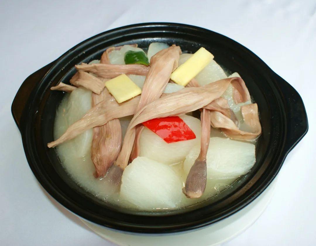 白沙油鸭喉煲萝卜:经腌制风干的白沙油鸭喉与白萝卜一起,经老火焖炖后,油鸭喉的香味和油脂缓慢渗入汤中,使汤色乳白,喉管部分香软弹韧,越嚼越香,萝卜块则吸取了油香腊味而风味独特,其汤更是咸甜适宜,清香可口,受到人们喜爱。