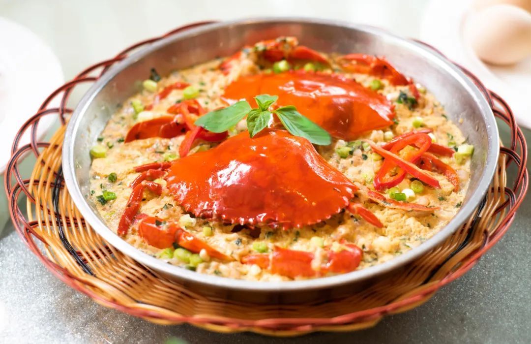 焗蟹饼:选用个大肉肥的虎门膏蟹,佐以鲜猪肉、鲜蛋、姜葱等。蒸熟的蟹饼,肉鲜蟹香蛋嫩,入口即化,美味无穷。