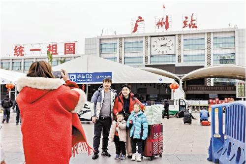 旅客在站前广场拍照留影。广州日报全媒体记者陈忧子 摄