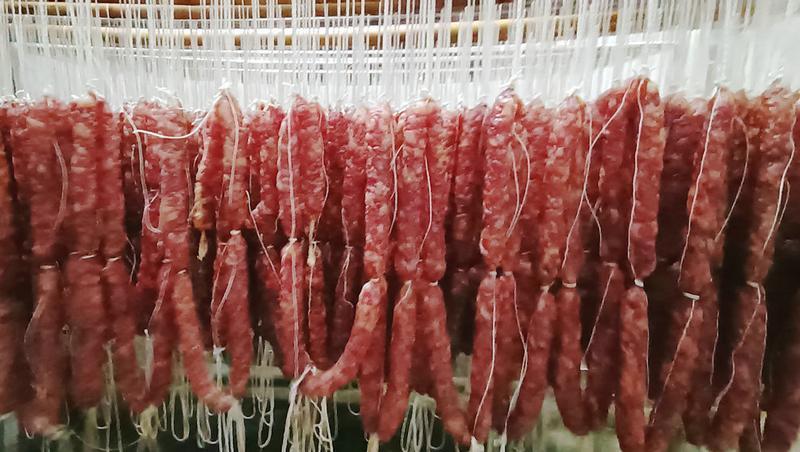 今天,记者一走进位于肇庆市高要区金渡镇的肇庆市食出食品有限公司,远远就闻到腊味的香味。在烘烤室里,一节节、一串串香肠整齐悬挂在烤架上,闪耀着金黄色泽,让人垂涎欲滴。工厂生产车间里一片繁忙:一排排腌制好的腊肉色泽红润,泛着油光的腊肠次第排开,一根根腊肠在工人的忙碌中入袋、密封、装箱,进入下一个销售环节。