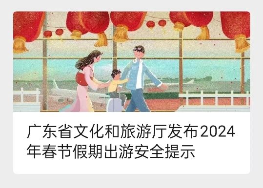 2024年春节即将到来,广东省文化和旅游厅近日发布出游安全提示,提醒广大游客密切关注旅游安全。过年期间,游客在出游时,要注意这些方面,平安健康出游。