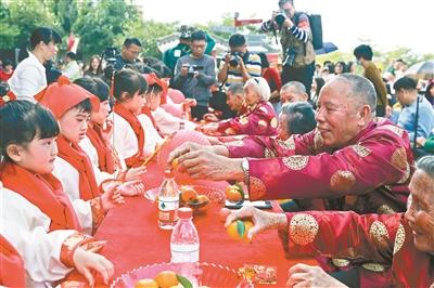 “卖懒”节上,老人向孩子赠送橘子。(茶山供图)