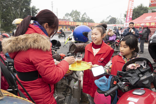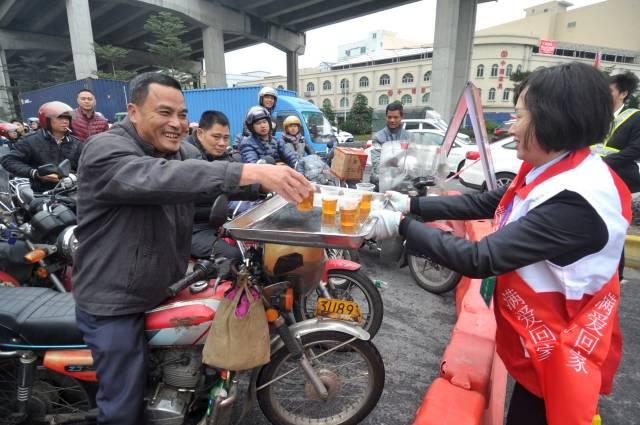 2017年1月13日春运第一天,佛山龙山加油站聚集了上千返乡摩托大军在此等候免费加油,志愿者为摩托大军送上热辣辣的姜茶驱寒。资料图片