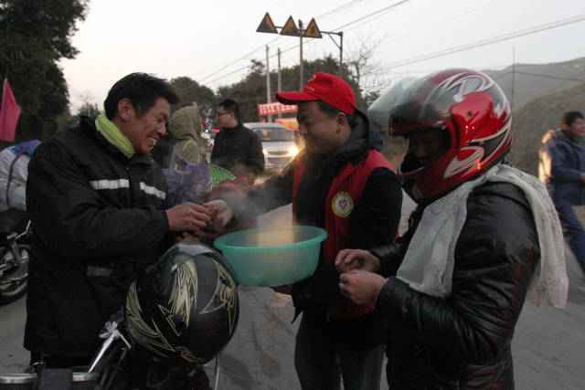 2014年1月22日,梅州返乡摩托大军路过丰顺县兵营山顶,志愿者为歇息的摩托车大军提供热粥。资料图片