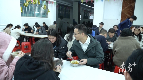 记者注意到,在饭堂就餐的员工看起来都很年轻。戴长根一路走过去,和年轻人混在一起,有说有笑。