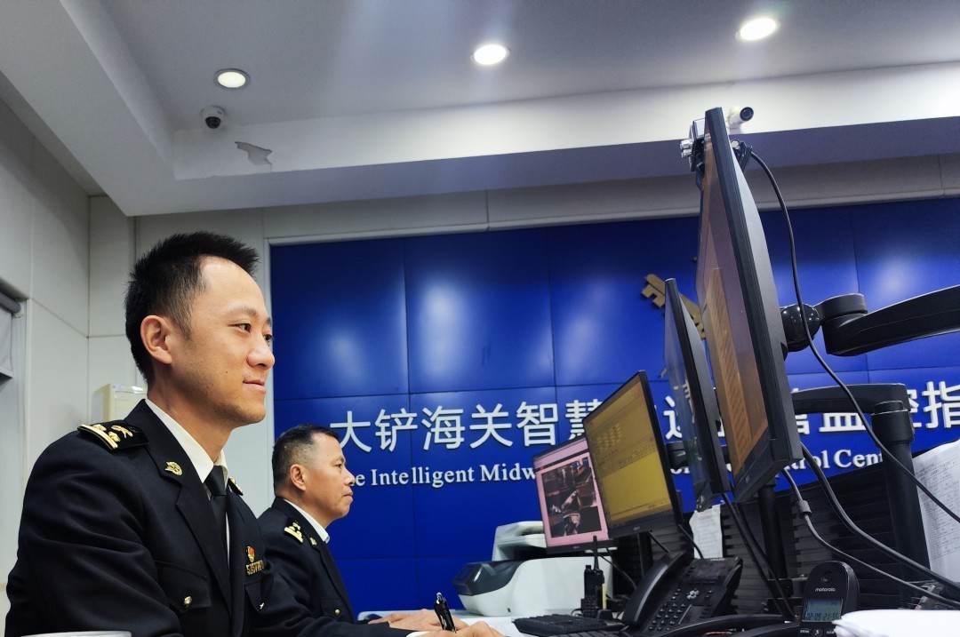 大铲海关关员周霆(左)与同事在监控指挥中心值守