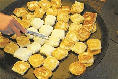 豆腐润,本来叫豆腐干。当地人认为“干”字不吉利,后改名豆腐润。一个小煎炉,一张平底锅,一把老剪刀,老板习惯把豆腐润剪成一个个小三角形。数百年来,豆腐润的美味就是通过最“简陋”的工具代代传承。伴随着柴禾烧旺,嫩白的豆腐块在热油的鼓噪下,开始噼哩啪啦地蹦跳,在食客们饶有兴致地围观下,这个不大的煎锅就像一个小小的舞台,老板手中的剪刀是指挥棒,剪刀和锅铲的铿锵碰撞是“伴奏”,豆腐润仿佛被注入了灵魂,开始了美食之舞,不断翻动下,它们一个个优美地翻转又翻转,完成由素白到金黄的渐变,姿态那么优美,欣然接受众人的掌声,这种“看比吃更有味”的场面,也成为七拱圩市一道特别的乡土风景。
