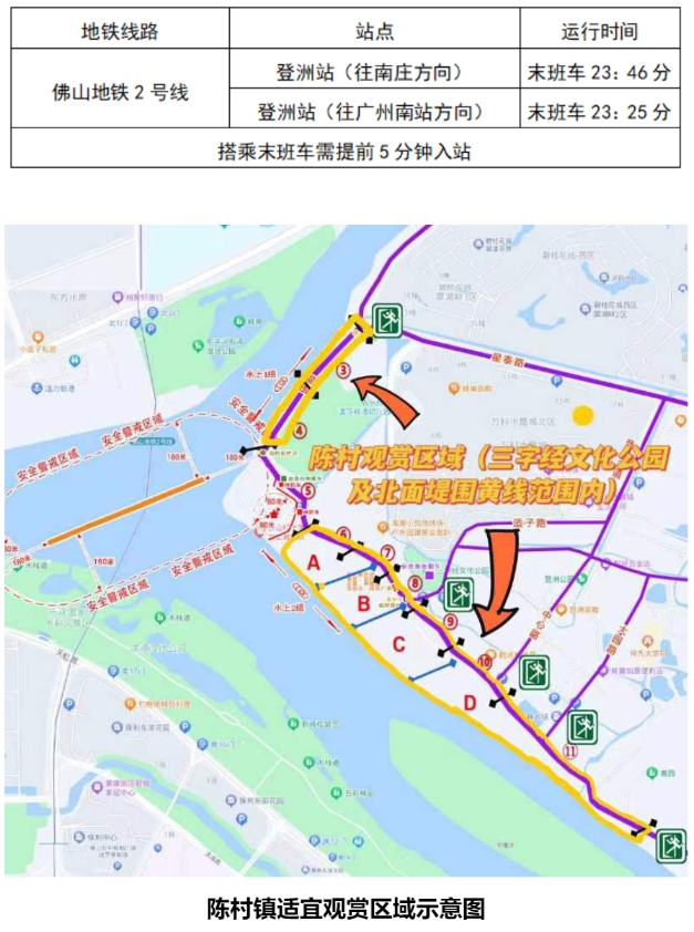 2、禅城方向的市民可直接搭乘佛山地铁2号线到达登洲站B1、B2出口,然后步行至观赏点;