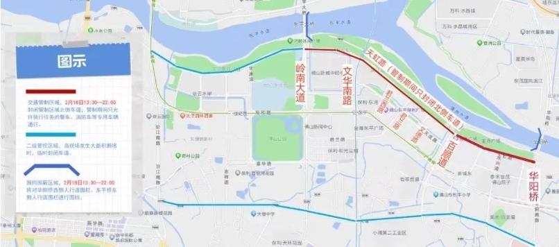 陈村交通管制:2月18日12时起至活动结束,封闭华阳大桥底至佛陈大桥底堤围路段,禁止一切车辆通行。2月18日16时起至活动结束,华阳路登洲大道路口、华阳路诚业路口禁止非住户车辆进入管制区域(摩托车、电动车除外)。星泰路登洲大道路口东往西方向禁止车辆进入堤围路方向,北侧道路将用作行人专用通道前往观看区域;适子路登洲大道路口东往西方向禁止车辆进入堤围路方向,将用作行人专用通道前往观看区域;中心路诚业路路口北往南方向禁止车辆进入堤围路方向,车辆请往诚业路或登洲大道东侧段通行。2月18日16时起至活动结束,登洲大道实施单向行驶;堤围路段佛陈大桥底至千红路实施西往东单向行驶,沿线允许车辆靠右停放;华阳路、佛陈路禁止车辆停放。围挡围闭区域:佛陈大桥南侧及华阳桥西侧设置高围挡围蔽,行人及车辆请勿驻留、围观。