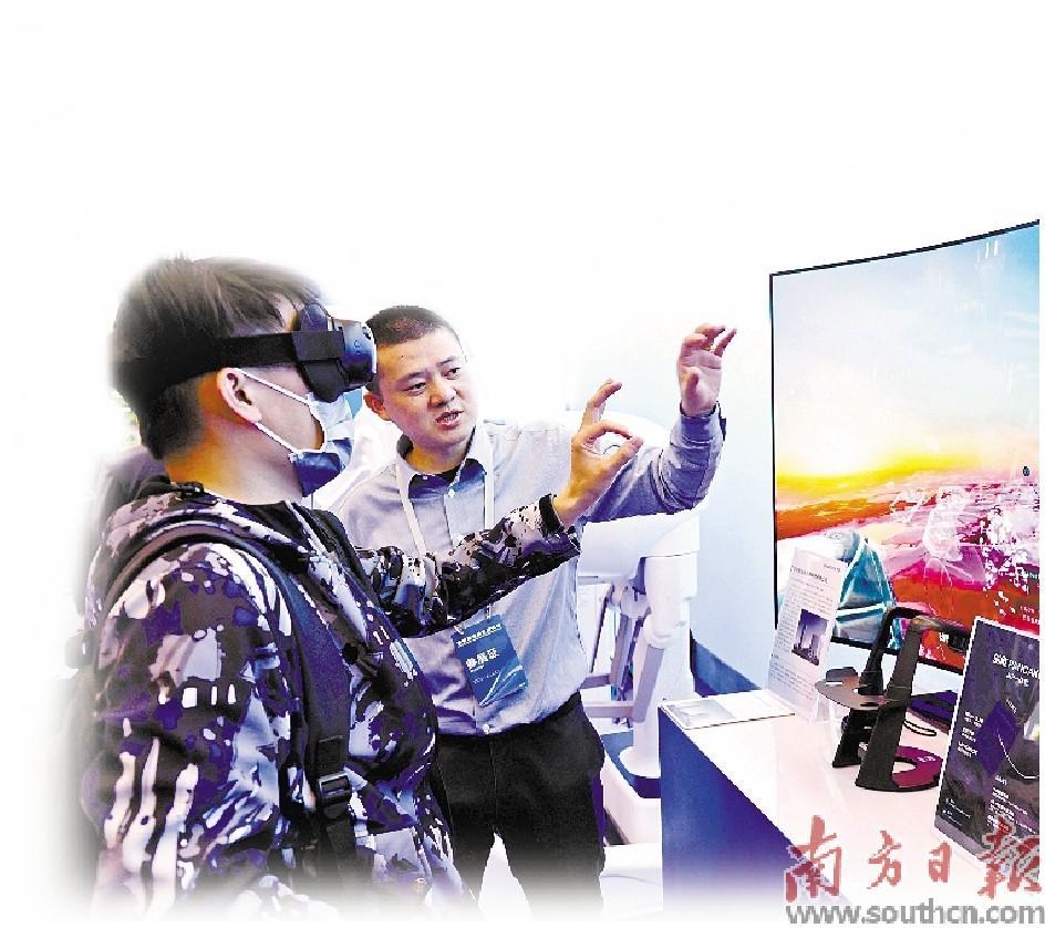 全省高质量发展大会召开当天,广东同步举办产业科技融合发展成果展。上图为深圳展区,参会嘉宾探展体验MR眼镜。下图为广州展区,上天入海“神器”亮相。