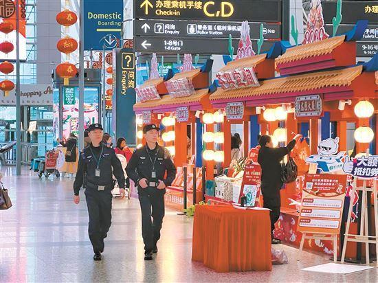 省公安厅机场公安局民警在广州白云国际机场航站楼执勤。