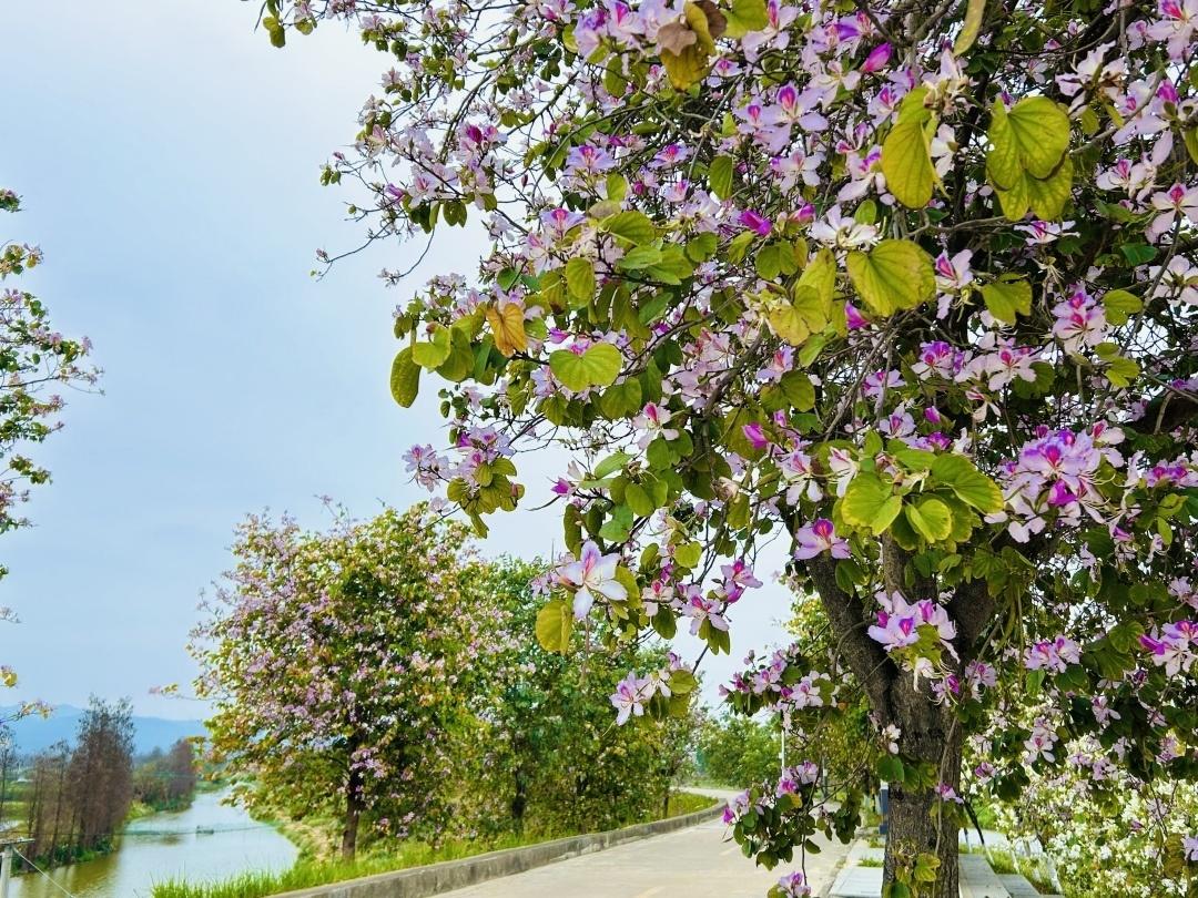 春光明媚,鹤山市古劳镇升平河河堤沿线近2公里的宫粉紫荆花陆续绽放,吸引市民游客前来赏花拍照。