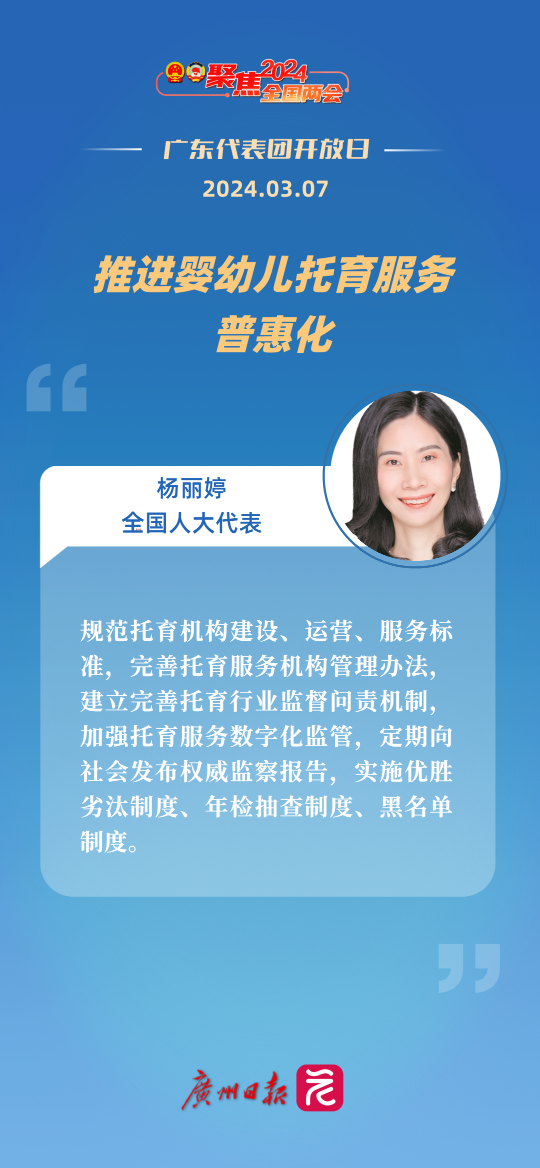 “《政府工作报告》提出,推动养老、育幼、家政等服务扩容提质,支持社会力量提供社区服务。多渠道增加托育服务供给,减轻家庭生育、养育、教育负担。我听了之后,倍受鼓舞。”全国人大代表、广东省社会科学院哲学与宗教研究所所长杨丽婷表示,“幼有所育”是家事也是国事。当前,婴幼儿照护能否得到有力的社会支持,已经成为影响家庭生育意愿的重要因素。“建议积极推进托育服务普惠化、规范化、法治化。这不仅是完善生育配套政策的有效手段,更是新时代重大的民生工程。”杨丽婷说。