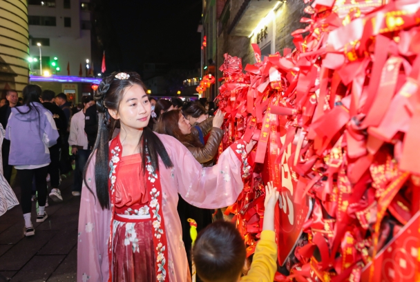 市民将带着美好寓意与期待的红飘带系在朱紫街内。