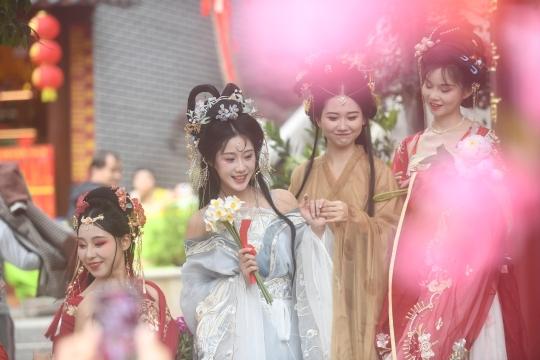 晨光里,身着霓裳汉服的少女们款款进场,螓首蛾眉,巧目顾盼,瞬间引来一片欢呼和掌声,特型演员的她们是今天的“花神”,紫薇、水仙、桂花、兰花……花色与服色相衬,花儿此刻在人间有了“代言人”。